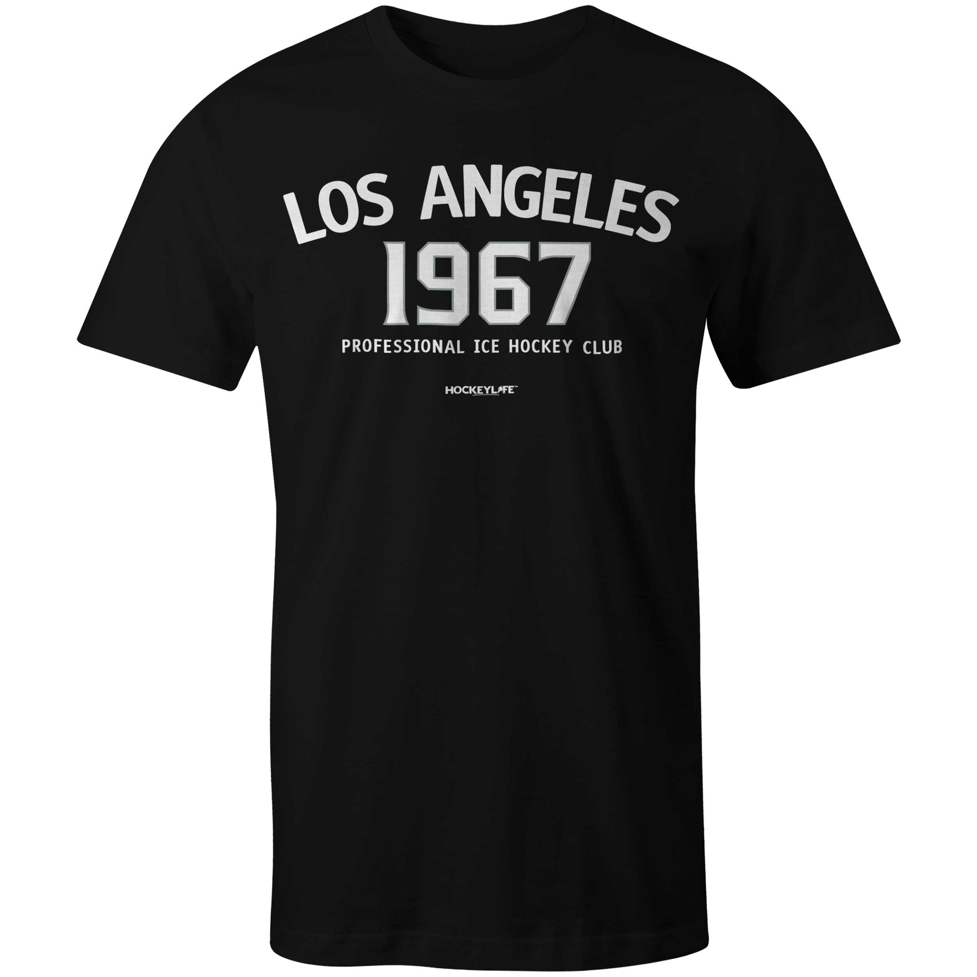 Our 100% cotton Los Angeles Professional Hockey Club tee shirt includes the year the Kings were founded in the numbers found on the team's home jersey. Shown here in black. Also available in white.