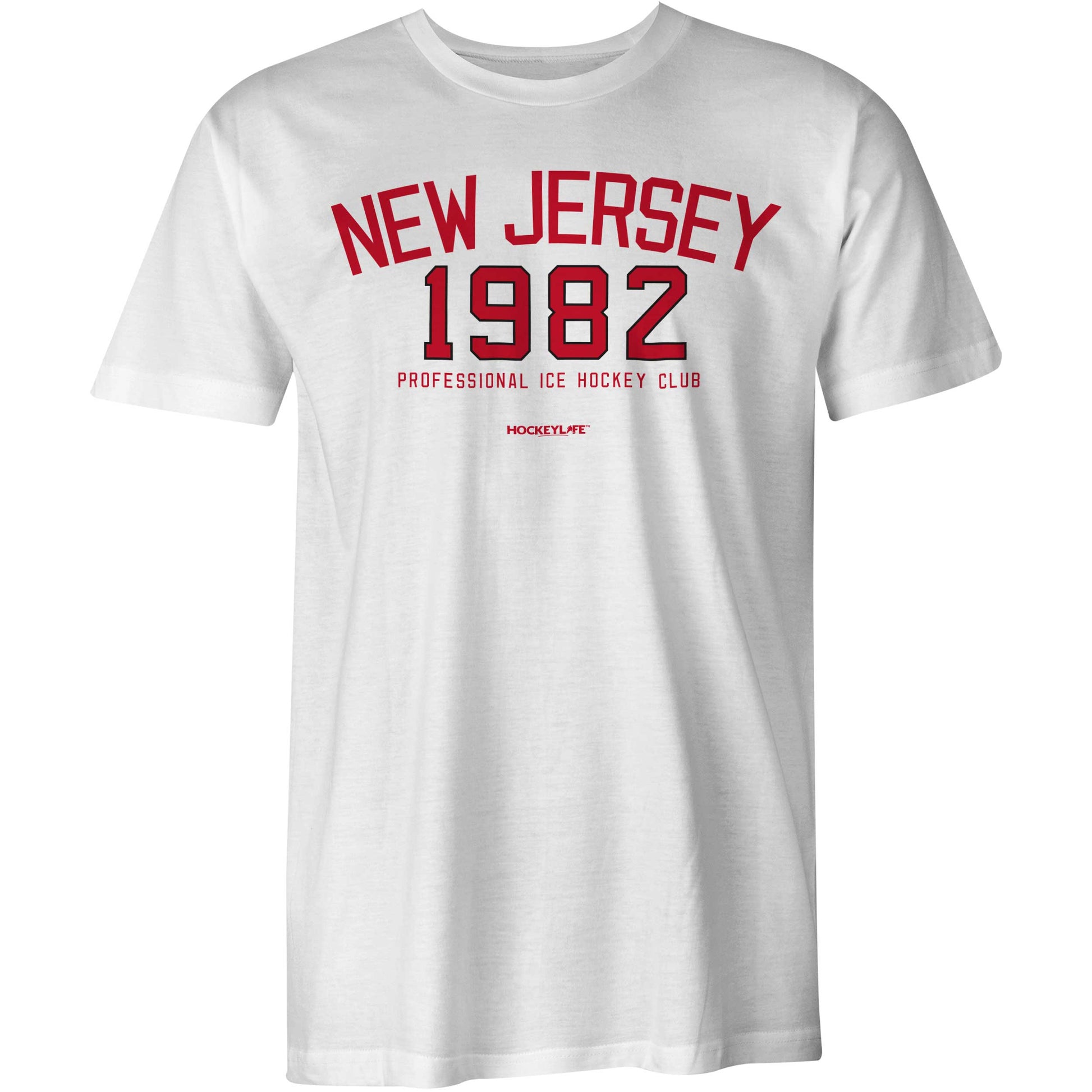 Our 100% cotton New Jersey Professional Hockey Club tee shirt includes the year the Devils moved to Jersey in the numbers found on the team's road jersey. Shown here in white. Also available in red.